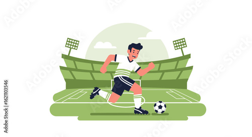 Fototapeta premium Illustration of a soccer player dribbling the ball on a soccer field with stadium backdrop