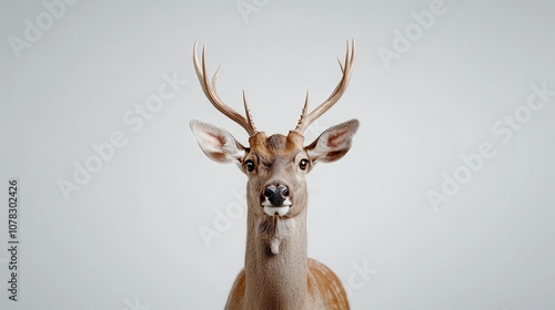 © Phongsri, Naklejka premium Illustration of a stag facing forward, with impressive antlers reaching upward, set against a bright white background, perfect for natural elegance
