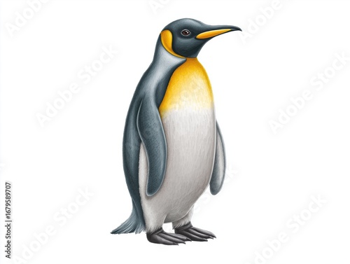 Fototapeta premium Illustration of a standing penguin with distinctive black and white feathers, showcasing vibrant orange accents on its beak and neck, representing wildlife and nature conservation themes