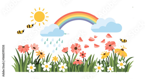 Fototapeta premium Illustration of a sunny day with a rainbow clouds flowers bees and petals falling from the sky scene