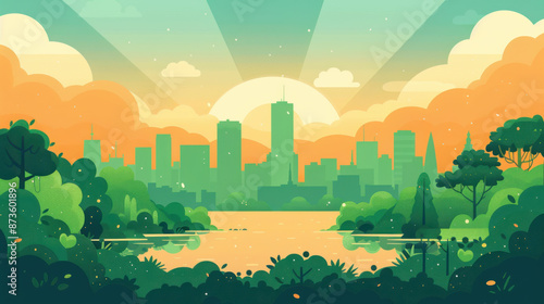 Fototapeta premium Illustration of a sustainable cityscape with skyscrapers surrounded by a vibrant green park, highlighting eco-friendly urban living.