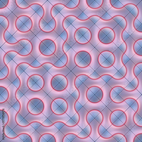 © Andrey_A, Fototapeta premium Illustration of a symmetrical, colorful, wavy pattern consisting of multiple square tiles, each containing an abstract geometric design. 3d rendering