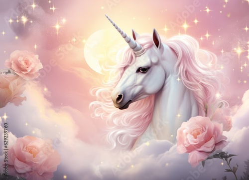Fototapeta premium Illustration of a vibrant unicorn painting adorned with pink roses created...