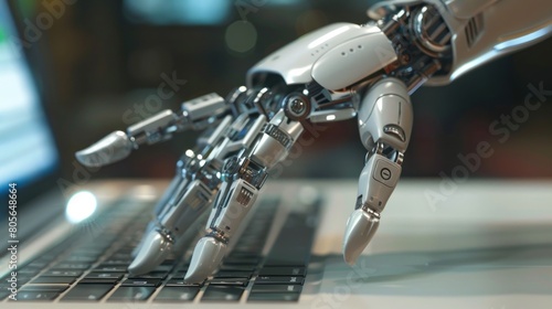 © paryati, Fototapeta premium Illustration of a white AI robot hand doing Typing on a Modern Laptop. Ai generated