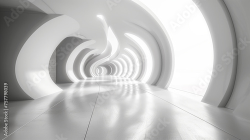 © _Dmitrich_G, Naklejka premium Illustration of a white circular room. Abstract architecture background. Futuristic minimal design. AI generative