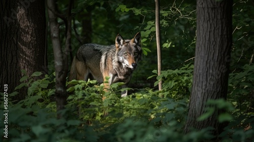 © Tuyres, Fototapeta premium Illustration of a wolf in a forest. Generative AI.