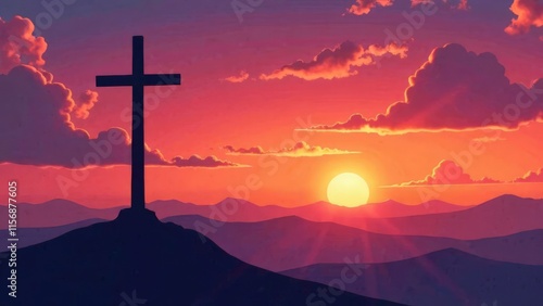 © OLGA RA, Obraz premium Illustration of a wooden cross on top of a mountain at sunrise.