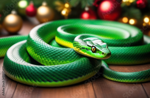 Obraz premium Illustration of a wriggling green snake with pine sprigs and blurred light will create a festive design for Christmas and New Year cards, invitations and advertisements