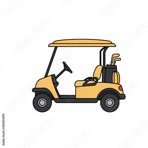 Fototapeta premium Illustration of a yellow golf cart with clubs in a bag parked on a golf...