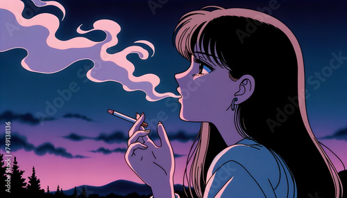© Yoru, Obraz premium Illustration of a young woman smoking a cigarette in the night in Japanese anime style.