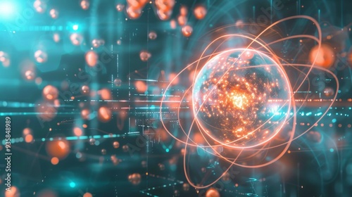 Obraz premium Illustration of atom model: vibrant nucleus, blue particles (protons/neutrons), orange electron shell, futuristic cyberpunk theme, dynamic visuals.