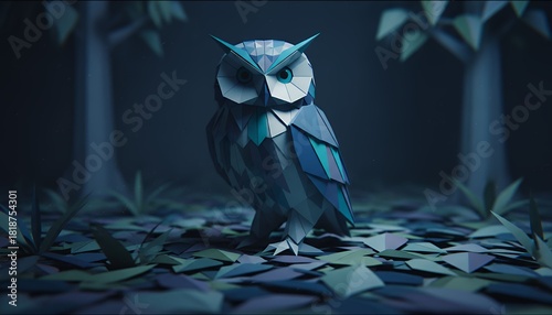 © DhanaStudio, Fototapeta premium Illustration of blue low poly owl standing on forest ground at night vector art