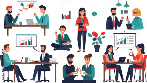 © Wajid, Naklejka premium Illustration of business people in various office settings with charts and graphs and laptops and tablets