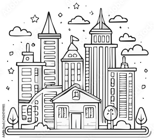 Fototapeta premium Illustration of City Skyline with Buildings, Trees, Clouds and Stars