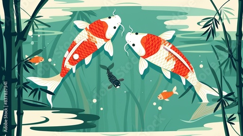 Fototapeta premium Illustration of colorful koi fish swimming in a serene pond surrounded by bamboo plants and other small fish.