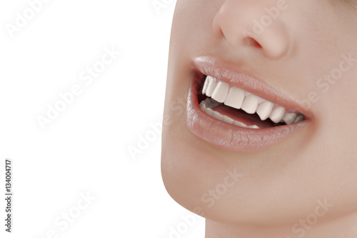 © sebos, Obraz premium Illustration of dental care. Perfect teeth. Close-up of beautiful and healthy woman smile. 3d render.