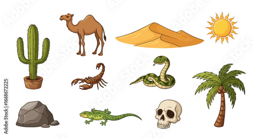 Naklejka premium Illustration of desert elements including a camel, cactus, sand dune, and desert animals scene