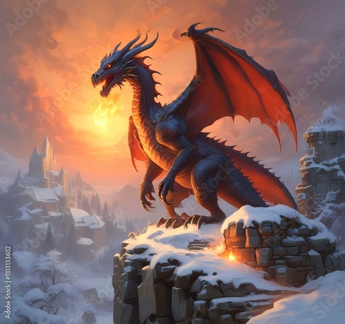 © BetiBup33, Naklejka premium Illustration of dragon sitting on castle wall.