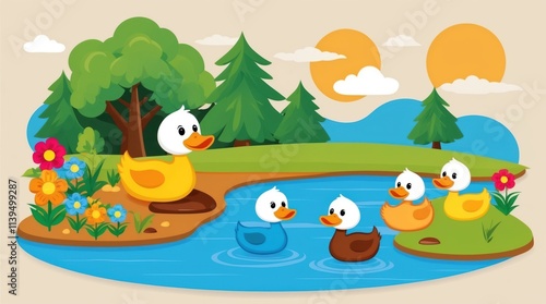 Fototapeta premium Illustration of ducks swimming in a tranquil lake surrounded by nature colorful flowers and trees