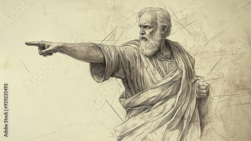 Fototapeta premium Illustration of Eliphaz’s Faith - Gesturing Towards the Horizon, Symbolizing God’s Ultimate Justice, Beige Background
