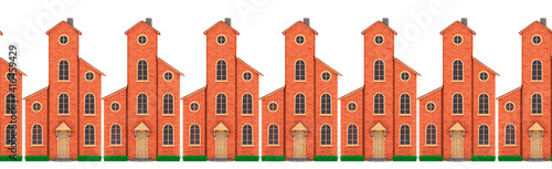 © Kler, Fototapeta premium Illustration of fantastic brick houses with European-style tiled houses arranged in a row. Isolated seamless pattern on white background. 3D Render.