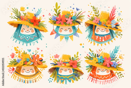 Fototapeta premium Illustration of Festa Junina dolls wearing colorful dresses and straw hats adorned with flowers. Festive and cultural theme. Design for print, poster, and greeting card.