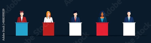 Obraz premium Illustration of five individuals standing at podiums during a political...