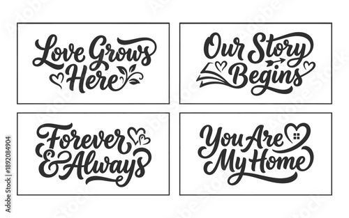 © Sabirina, Fototapeta premium Illustration of four love themed quotes with heart designs on white background
