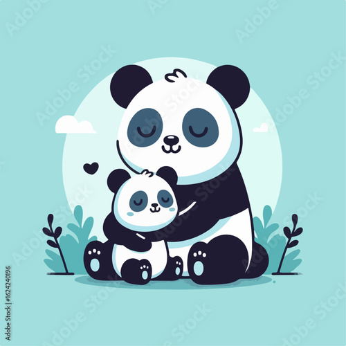 Fototapeta premium illustration of funny panda hugging his child on blue background