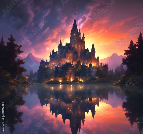 © BetiBup33, Obraz premium Illustration of glowing mystery tower castle in night.