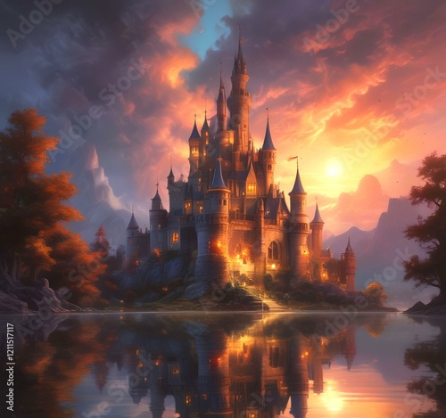 © BetiBup33, Obraz premium Illustration of glowing mystery tower castle in night.