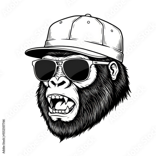 © Vernon, Fototapeta premium Illustration Of Gorilla Head Wearing Cap And Sunglasses In Black And White