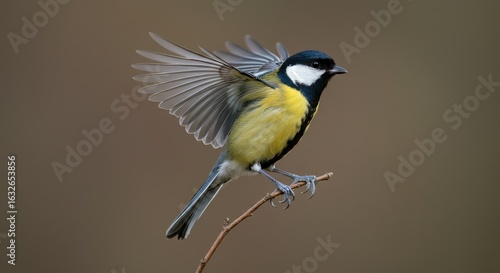 Fototapeta premium Illustration of great tit perched on a branch about to take flight with wings...