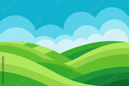 Obraz premium Illustration of green hills under a cloudy blue sky
