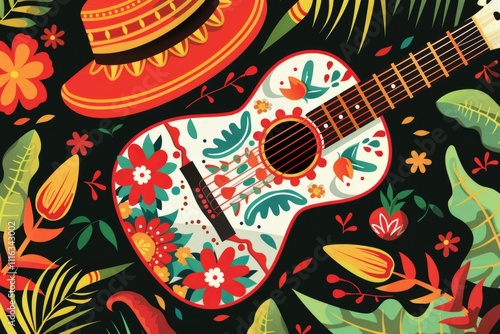 © Alexandr Efimov, Obraz premium Illustration of guitar with floral and tropical design elements.