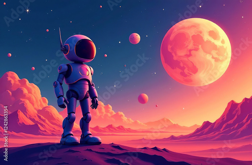 © dramapalma, Obraz premium Illustration of humanoid robot on space planet picture. AI Generative