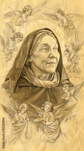 Fototapeta premium Illustration of In Mystical Vision, St. Teresa of Ávila Surrounded by Angels, Biblical Illustration, Beige Background, Copyspace