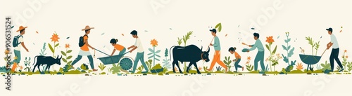 © Georgii, Fototapeta premium illustration of Indian farmers working with oxen in the field