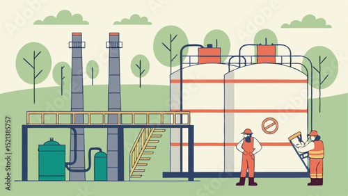 Fototapeta premium Illustration of industrial plant with storage tanks, smokestacks, and workers in safety gear on a green field