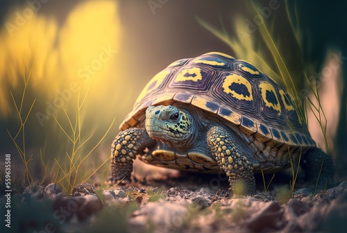 Obraz premium illustration of Leopard tortoise in nature green background with sunlight bokeh