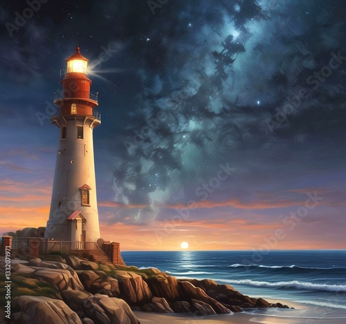 © BetiBup33, Naklejka premium Illustration of lighthouse with starry sky.