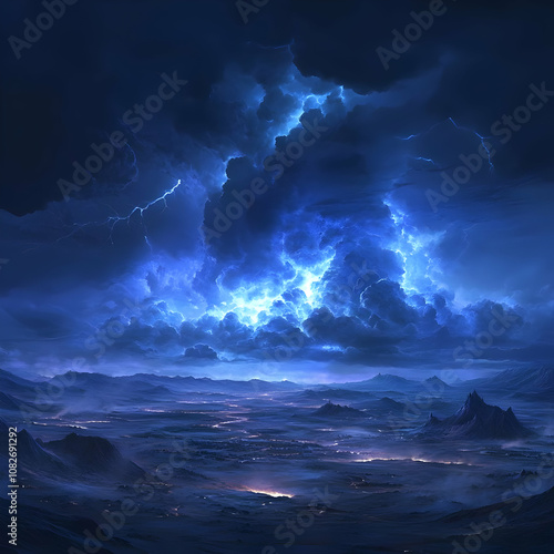 © queen, Fototapeta premium Illustration of Lightning Storm over Dark Mountains