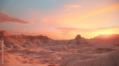 © Muzamil, Fototapeta premium illustration of majestic view of rough uneven solid surface of badlands in evening at sunset time.