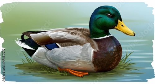 Obraz premium Illustration of mallard duck on grass, in pond.