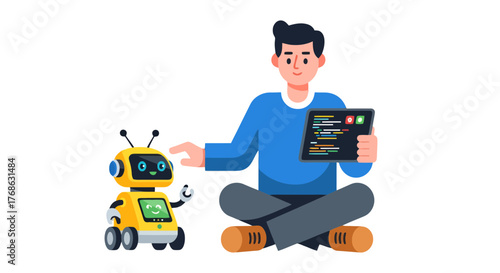 Fototapeta premium Illustration Of Man And Robot Interacting With Coding Tablet Representing...