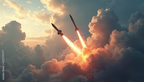 © Viktor, Fototapeta premium Illustration of military rockets launch above clouds sky. Missiles fire, leaving smoke, flames. Symbolizes missile attacks, air alerts, military defense, tech power.