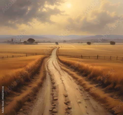 © BetiBup33, Obraz premium Illustration of misty road through a brown field.