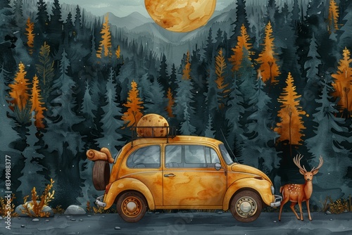 © imtde.sign, Fototapeta premium Illustration of mountain winter solstice landscape with a large moon and night clear sky with tree silhouette with moonlight, silhouette mountain with dark valley with dew illustration