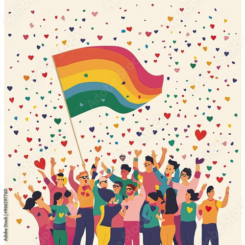 © Javid, Obraz premium Illustration of people joyfully celebrating pride with rainbow flags and hearts. AI generated image