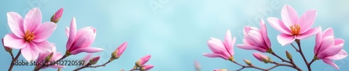Naklejka premium Illustration of pink magnolia flowers on a pastel blue background, delicate,...